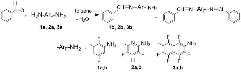 A priori there are two problems that get in the way of the preparative use of the above reactions: low reactivity of the amino group in polyfluorinated substrates and the necessity to limit a conversion to a modification of only one of the two amino groups. It is known that the exhaustive fluorination of the benzene ring reduces the reactivity of phenylenediamines to acylating agents by a factor of 105 as a result of the total acceptor effect of electronegative fluorine atoms [15]. For this reason pentafluoroaniline does not react with benzaldehyde under conditions typical for non-fluorinated arylamines. To synthesize imines, pentafluoroaniline is preliminary treated with thionyl chloride to form N-sulfinylpentafluoroaniline, which then gives the desired products in high yields by the reaction with aromatic aldehydes [16]. However, the applicability of this approach for the modification of one of the two amino groups in arylenediamines is not obvious. In principle, the reaction of pentafluoroaniline with aldehydes can be carried out by prolonged refluxing in anhydrous solvents with water-removing agents (in the presence of MgSO4 in CH2Cl2 [17], molecular sieves in toluene [18]), or by heating at 160 °C without solvent as well. [19]. Preparation of N,N'-bis-benzylidene derivatives of tetrafluoro-meta-phenylenediamine was also reported [20]. Examples of the arylenediamine modification when only one of the amino groups remains unchanged have not been described in literature.