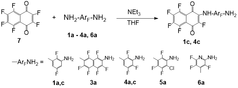 Reaction of non-fluorinated arylamines with benzoquinone occurs in methanol at room temperature and result in the formation of 2,5-bis-amino derivatives in high yields [10]. Substitution of halogens in polyhalogenated (Hal = Cl, F) benzo- and naphthoquinones for various uncharged nucleophiles – amines, alcohols, thioalcohols – proceeds even faster [11, 13]. We used polyfluorinated arylenediamines with different framework and the number of fluorine atoms as nucleophiles: 2,5-difluoro-1,3-phenylenediamine (1a), 2,7-diaminohexafluoronaphthalene (3a), 2,4,5-trifluoro-1,3-phenylenediamine (4a), 4-chloro-trifluoro-1,3-phenylenediamine (5a), and 2,4-diaminotrifluoropyridine (6a). It was found that para-benzoquinone does not react with these diamines even under refluxing in toluene for 72 hours; the starting compounds were returned. Hexafluoro-1,4-naphthoquinone (7) also gives no substitution products under the action of the exhaustively halogenated diamines 3a, 5a, 6a in tetrahydrofuran under heating. The addition of triethylamine to bind HF does not affect the result. Within a day, naphthoquinone 7 is completely destroyed under these conditions while diamines are unchanged. In contrast, the more nucleophilic compounds 1a and 4a with one of the ortho-positions to the amino group not occupied by a fluorine atom, react with naphthoquinone 7 in the presence of NEt3 in tetrahydrofuran at 45-50 °C in an argon atmosphere to form polyfluoroarylaminonaphthoquinones 1c and 4c (Scheme 2). The highest yield of the products is observed when a reaction time is 20 h. It should be noted that this conversion, in contrast to the reaction with benzaldehyde, occurs selectively at one amino group; polyfluorinated bis-quinone derivatives of arylenediamines are not detected. The isomer selectivity in the reaction of non-symmetric phenylenediamine 4a is also high, only the amino group having a hydrogen atom at the ortho-position undergoes modification. Compounds 1c and 4c, synthesized for the first time, were isolated by chromatography in yields of 50-60% and were characterized by spectral methods.
