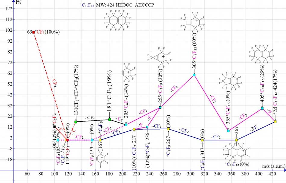 In the second, weaker ion series, starting with the detachment of CF2 (blue line, yellow square) (Fig. 7), instead of the synchronous detachment of three fluorine atoms (Fig.6), there is a synchronous detachment of only two fluorine atoms, apparently from two trans positions, and then the detachment of one more fluorine atom from the five-membered cycle. This is indirectly confirmed by the subsequent ejections of four CF2 groups, with the formation of the +C5F5 ion.
