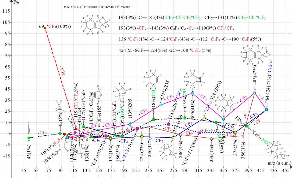 Figure 4. Three main ionic series (M -.F, M -CF, M -CF2) and their branches in the mass spectrum of perfluoro [8-methylbicyclo[4.3.0] nona-1(6)-en] C10F16 MW: 424 Institute of Organic Chemistry, USSR Academy of Sciences NIST#: 110818 ID#: 42546 DB: mainlib.
