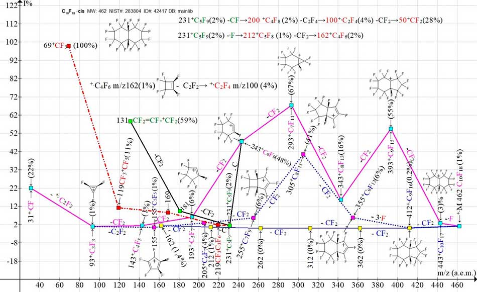 Figure 6. Two main ion series (M -.F, M -CF2) and their branches in the mass spectrum of C10F18 perfluorodecalin, cis- MW: 462 (A. Pleshkova) INEOS USSR Academy of Sciences NIST#: 283804 ID#: 42417 DB: mainlib.