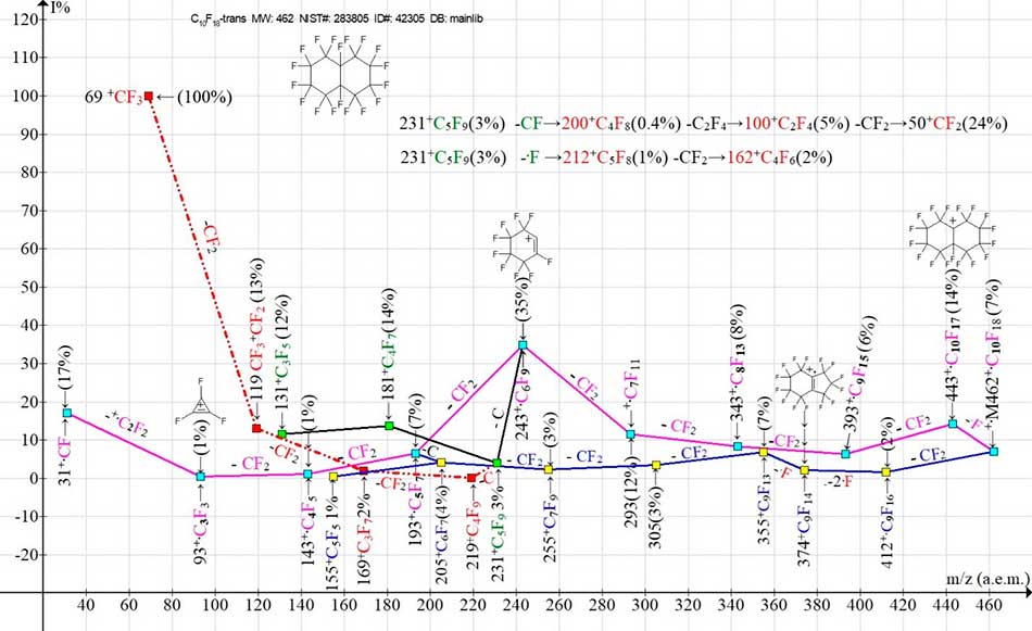 Upon detachment of a carbon atom from the +C6F9 ion with m/z 243, this intense series branches to form a perfluoroalkyl series of ions (black line - green square) with m/z 231 +C5F9, 181 +C4F7 and +C3F5. Upon detachment of a carbon atom from the +C5F9 ion with m/z 231, the allyl series branches to form a perfluoroalkyl series of ions (red dotted line - red square) with m/z 219 +C4F9, 169 +C3F7, 119 +C2F5, 69 +CF3 (100%). The series of the most intense peaks and the series of the weakest peaks combine to form the fragment ion +C3F3 m/z 93 and its fragment ion +CF m/z 31. Two more ion series arising from the detachment of the +CF radical from the ion with m/z 231 to form the perfluoroolefin series of ions, as well as the .F atom to form ions with m/z 212 and m/z 162 are not reflected in the ion series graph (Fig. 6) for reasons that make it difficult to view, but are presented as two digital sequences.