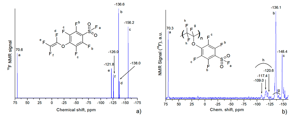 Figure 1 presents the 19F NMR spectra of FSO2C6F4OCF=CF2 monomer and the corresponding homopolymer. They were obtained at «BrukerAM-300» spectrometer (282.40 MHz), the homopolymer was dissolved in hexafluorobenzene.