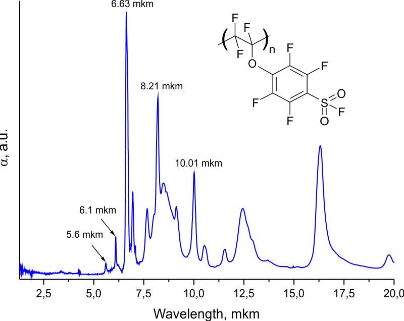 Used for the preparing of E8S homopolymer FSO2C6F4OCF=CF2 monomer had been produced by PiM-Invest company and possessed chemical purity more than 99%. The synthesis was performed in Teflon ampoules with the volume of 1-4 ml in cylinder-piston molds at the pressure of 1.5-1.6 GPa at the temperature of 190-225 °C. The reaction time ranged from several days to two weeks. After it the mold was slowly cooled down to the room temperature, the pressure was reduced to the atmospheric one and the ampoule was released. The substance obtained after the ampoule`s opening was a viscous transparent (or slightly colored) viscous liquid containing, in addition to the homopolymer, various additives (initial monomer, dimers, oligomers and other by-products of the reaction). To remove these impurities the obtained substance was vacuumed to a constant weight at 85 °C. A stiff turbid liquid was the result. The homopolymer was reprecipitated with methanol, centrifugated during 30 minutes at 6000 rpm, decanted and dried to a constant weight at 60 °С and 5 mbar vacuum during 10 hours. A white colored powder was obtained as the result. The reaction yield did not exceed 20%. Element analysis was carried out for two samples, for the first one it was found (%): C, 29,31; F, 46,32; S, 9,76; the other one provided (%): C, 28,84; F, 44,87; S, 9,63.