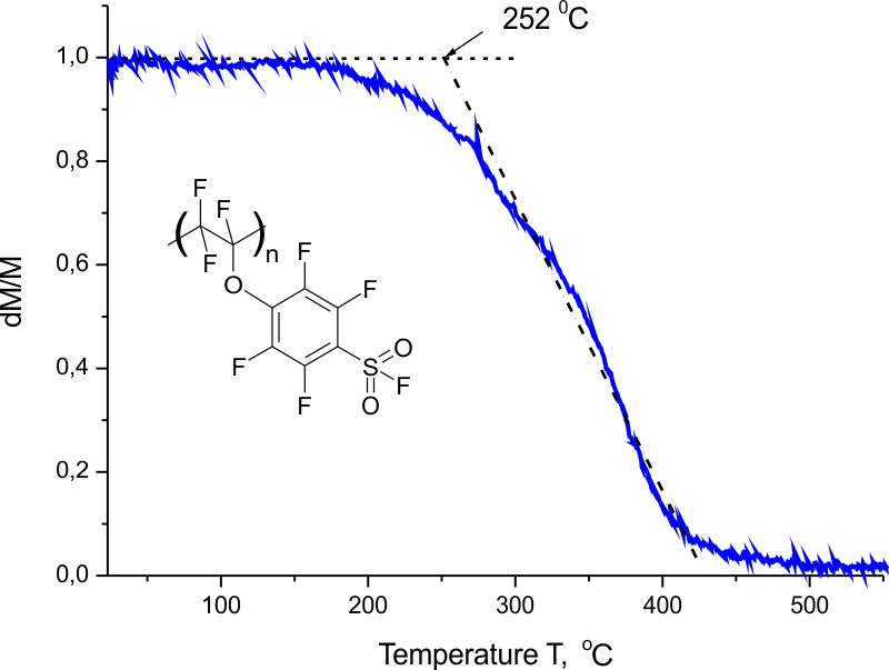 Converting chemical energy into electrical energy electrochemical devices and, particularly, hydrogen fuel cells with proton-exchange membranes are of great interest for scientific researches and industry due to their high energy conversion efficiency, low environmental impact, wide applicability in various fields ranging from portable electronic devices to automobiles, trains, vessels, aircrafts and space vehicles [1]. Proton-exchange membrane is one of the key elements of a fuel cell. It supports transport of protons, produced in hydrogen catalytic oxidization at the anode, participates in oxygen reduction with water formation at the cathode and also prevents unimpeded uncontrollable interaction of hydrogen with oxygen [2 - 3]. Currently low temperature fuel cells with proton-exchange membranes made of fluorinated sulfonic-acid polymers acquired significant distribution, for instance, with commercially available membranes of Nafion, Aciplex, Aquivion, Dyneon. Membranes of that type exhibit high chemical, thermic and mechanical stability, have appropriate proton conductivity under high hydration degree [4-10]. An immense number of fluorinated monomers, particularly, with various protogenic groups have been synthesized for the development and the fabrication of proton-exchange membranes [11-20]. Proceeding in this way, we have elaborated a new Nafion-like monomer, namely FSO2C6F4OCF=CF2, in which FSO2- group is tied to CF2=CFO- substitute by perfluorophenyl fragment, rather than perfluoroaliphatic one [21]. The present work deals with the investigation of the polymerization capability of the monomer.