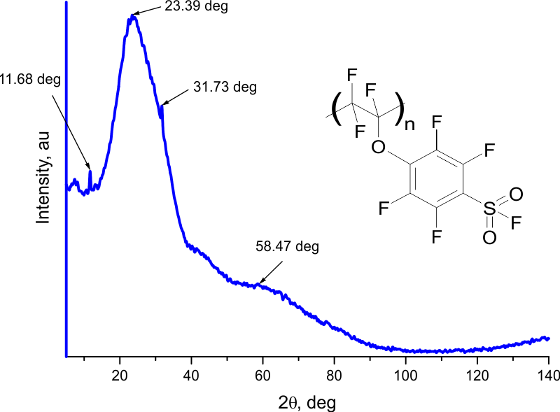 Structural diagnostics of E8S homopolymer was carried out using Rigaku Miniflex600 wide-angle X-ray diffractometer (Cu, λ=1.54184 Å), see Fig. 5. It is found that the diffractogram demonstrates wide “halos” near 2θ ≈ 23.39 and 58.47 deg. and small peaks near 2θ ≈ 11.68 and 31.73 deg. One can conclude from the analysis of Fig. 5 that E8S homopolymer is amorphous with some degree of polycrystallinity.