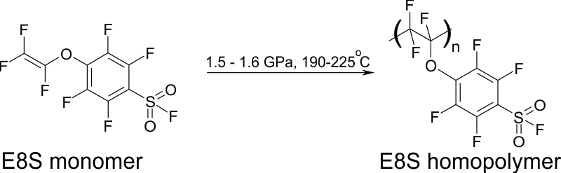 The polymerization of FSO2C6F4OCF=CF2 monomer (hereafter called E8S) is found to undergo under the pressure of 1.5-1.6 GPa and the temperature of 190-225 °С without the use of any radical polymerization initiators, see Scheme 1. The resulting E8S homopolymer is a white powder-like substance.